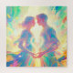 Relaxing Puzzle - Romantic Twin Soul Love Man and Woman with Heart - This beautiful vivid generative content Painting shows a romantic twin soul couple, a young man and woman looking in each other's eyes and touching hands creating a heart out of light. The art is an a soft pastel hue of yellow, green, orange, salmon.