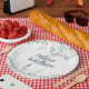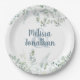Romantic floral wedding paper plates, featuring a delicate watercolor bouquet with white gentle flowers, greenery, and other botanical foliage, over a classy white background. Easily edit the template fields to add your names in a classy slate grey font.