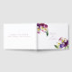 This romantic wedding guestbook features a floral design. The background is a simple and elegant white with purple watercolor violets. A delicate bouquet of violet flowers is picture in the top left, with the names of the couple printed below.