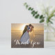 Share your gratitude in style with this romantic wedding thank-you card, featuring a stunning full-photo design of the bride and groom against a breathtaking beach sunset. The elegant script “Thank You” overlay adds a timeless touch, making it perfect for sending appreciation to guests, family, and friends after your special day. Easily personalise with your wedding photo to create a heartfelt keepsake that captures the love and beauty of your celebration. Ideal for beach weddings, destination weddings, or any couple wanting a picture-perfect way to say thanks.