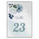 Beautiful botanical table number card featuring romantic white, dusty blue and navy blue flowers with green leaves.