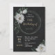 Unique birthday party invitation featuring romantic white flowers and green leaves on black background.