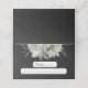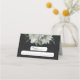Unique place card featuring romantic white flowers and green leaves on black background.