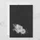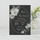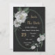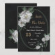Unique wedding invitation featuring romantic white flowers and green leaves botanical geometric frame black background.