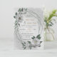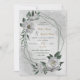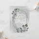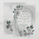 Unique wedding invitation featuring romantic white flowers and green leaves on a beautiful geometric frame.