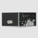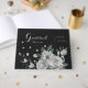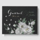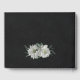 Unique wedding guest book featuring romantic white flowers and green leaves on black background.