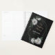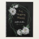 Unique wedding planner featuring romantic white flowers and green leaves on black background.