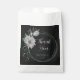 Unique wedding favour bag featuring romantic white flowers and green leaves on black background.
