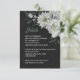 Unique wedding enclosure card featuring romantic white flowers and green leaves on black background.