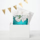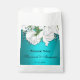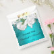 An elegant and sophisticated aqua floral wedding favour bag, featuring a metallic aqua/teal colour with a beautiful white bridal bouquet of roses at the top. All details can be personalised to suit. This treat bag for the wedding reception guests would be suitable for a garden wedding, floral themed event, boho wedding, aqua or teal-themed wedding, and more.