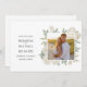 Elegant botanical wedding photo save the date with your best photo framed by bouquet of pristine white and ivory roses and gentle leaves over classic white background and
