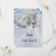 A romantic winter wedding Save the Date card featuring a painting of a winter wonderland scene with a couple with an umbrella.