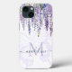 Enhance your iPhone with a touch of elegance and style using our captivating Romantic Wisteria Butterfly Monogram Script Name iPhone 13 Case. This exquisite design features delicate pastel watercolor lilac and lavender wisteria blossoms, accompanied by lush green leaves and a graceful butterfly silhouette. The customisable text boxes allow you to personalise the case with your own Monogram initial and name, beautifully rendered in script font.