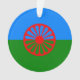 Official Romany gypsy traveller flag of green and blue representing the earth and sky with a red wagon wheel, representing travel.