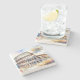 The coasters are gorgeous, a quality feel and heavy weight. They look like a precious archeological find. A rustic stone juxtaposed with a modern floral black and white print. I like the way the print goes slightly imperfect on the cut stone edges giving them a kind-of natural beauty.