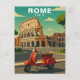 Embrace the Dolce Vita with this charming Rome Travel Card. This vintage-style illustration features the legendary Colosseum, the grandest amphitheater of the Roman Empire, paired with an iconic red Vespa scooter parked on a sun-drenched cobblestone street.