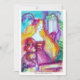 Balcony scene from Romeo and Juilet tragedy by William Shakespeare .Original contemporary watercolor painting with golden ,silver foil and iridescent colours in bright purple ,pink,green,yellow orange , teal colours .Painting by Bulgan Lumini (c).