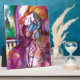 Balcony scene from Romeo and Juilet tragedy by William Shakespeare .Original contemporary watercolor painting with golden foil and iridescent colours in bright purple ,pink,green,yellow orange , teal,turquase, white ..Painting by Bulgan Lumini (c)