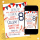 A baseball themed birthday party invite featuring vintage style baseball prints in a red, blue, and white colour scheme. Celebrate your little sluggers big day with this customised baseball party invitation!