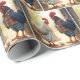 A rooster and hen dressed in human-like clothes stand facing each other with an egg between them inside a barn with sunlight filtering through
