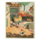 Rooster is keeps an eye on the hens in the farm yard from a vantage point on a pile of hay in front of the barn and chicken coop. A provincial farm house with a thatched roof in the Loire region of western France where the artist Benjamin Rabier lived.