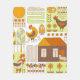 Rooster and two hens, eggs, flowers, house, drawing on white background. Geometric pattern, abstract, hand drawn, vintage