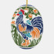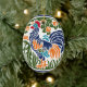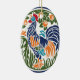 A colourful barnyard rooster, surrounded by fruit and flowers.