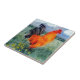 Ceramic tile featuring a colourful Cockerel strutting across the grass, from my original rooster chicken glass painting. ©Annabel Potter