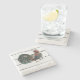 The coasters are gorgeous, a quality feel and heavy weight. They look like a precious archeological find. A rustic stone juxtaposed with a modern floral black and white print. I like the way the print goes slightly imperfect on the cut stone edges giving them a kind-of natural beauty.