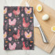 A black background decorated with a retro farmhouse style rooster and hen pattern in red, pink.