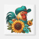 Colourful illustration of a rooster wearing a teal cowboy hat surrounded by lush sunflowers and turquoise flowers, showcasing a blend of rural charm with artistic flair.