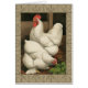 A rustic art print displaying a vigourous rooster and a hen in a hen house. The darc ecru border is pattern consists of spiral elements. This print would be a gread addition to a rural country home decoration.