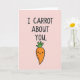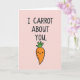 This greeting card features a soft pastel pink background with a simple, cozy layout that feels like a sweet note between close friends or a couple 🌷. In the upper two-thirds, the phrase “I CARROT ABOUT YOU” is stacked in dark, thick lettering, easy to read and centered. The words sit with generous spacing, giving the message room to breathe while keeping the focus on the joke. Below the text, a bright orange carrot character fills the lower portion, adding a warm, affectionate presence like it’s smiling directly at someone special 🐰. The carrot has a rounded cone shape, small horizontal marks for texture, and a tidy black outline that keeps the illustration crisp. Its face is simple with two dot eyes and a curved smile that suggests a tender, friendly attention. On top, leafy green fronds fan upward in a small cluster, contrasting against the pink background.