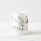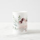 A mauv-ish open rose and burgundy peonies in bud are arranged with watercolor foliages for a contemporary design bone china floral mug.