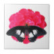 A digital painting of a blooming red rose being visited by a black butterfly.