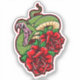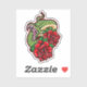 A venomous snake, depicted in a vibrant green hue, is coiled around a cluster of red roses. The snake's head is raised, its mouth open in a menacing hiss, revealing sharp fangs. The roses, with their thorns and delicate petals, contrast beautifully with the snake's predatory nature. The image is rendered in a bold, graphic style with intricate details, creating a visually striking and powerful composition.