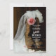 Invite guests to a casual pre marriage barn party honouring the cowgirl bride to be with the quaint Pink Country Rose and Cowboy Boots Last Rodeo Western Bachelorette Party Invitation. Customise it with the specific details of your country style event. This charming custom ranch theme Party Invite features a farm photograph of a pair of brown leather cowboy boots filled with a pink rose flower blossom and white bridal veil with a weathered barn wood background. Perfect inspo for an informal barn party celebration.