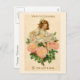 This vintage Valentine features a young girl sitting on top of a pretty bouquet of pink roses. Original text on the card says “Valentine Greetings To the One I Love”.