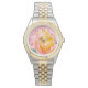 Sweet pink and gold rose bud decorates stylish watch. Available in many styles, this eye catching watch is an ideal gift idea!