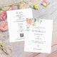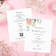 A chic white background. Decorated with a rose gold and blush pink floral, rose flower and green watercolored eucalyptus leaves, sprigs, greenery and a faux gold sprig. Personalise and add your names and wedding details. Black and green letters.