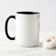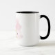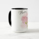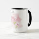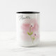 The cup features a delicate white ceramic design adorned with a floral illustration. The illustration consists of two blossoms on a single stem, set against a soft pink background. The word “Flower” is written above the illustration in a cursive, stylish font, adding to the cup’s simple and elegant aesthetic.