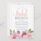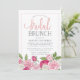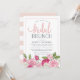 Elegant and modern floral bridal brunch invitation features a bottom border of roses in white, blush and fuchsia pink with lush greenery peeking out. Personalise with your bridal brunch details in elegant blush and grey-blue typography accented with handwritten style calligraphy. Cards reverse to blush pink and white stripes.
