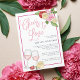 Elegant and modern bridal shower invitation for wine lovers features accents of roses in red, yellow and pink with lush greenery peeking out, and two clinking glasses of rosé wine. "Cheers to Love" appears in pink handwritten script lettering. Personalise with your bridal shower details in elegant blush and grey-blue typography, and customise the wine bottle with the couple's initials. Cards reverse to fuchsia pink and white stripes.