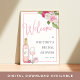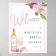 Colourful bridal shower welcome sign for wine lovers features accents of roses in pink and ivory with lush greenery peeking out, and a bottle and glass of rosé wine. Personalise with your bridal shower event name and date in elegant blush and grey-blue typography accented with handwritten style calligraphy, and customise the wine bottle with the couple's initials.