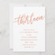Rose Gold 13th Birthday Party Invitations: Pretty rose gold 13th birthday party invitation design featuring bright rose gold foil look "thirteen" written in hand-lettering script typography. Contemporary lettering fills out the party details. [Note that while elements of this design will print to look like foil, no actual foil or metallic ink is used in creating the invitations - the rose gold foil is a printed effect.]