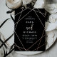 These modern wedding invitations feature a dark moody black background and rose gold foil geometric lines for a glamourous, elegant look.