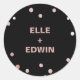 These rose gold and black glam wedding envelope seals are perfect for a sophisticated or evening wedding. The design features beautiful faux rose gold foil confetti on a black background for a bold glitz and glam look. Personalise the label with the names of the bride and groom.