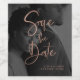 These modern, elegant wedding save the date wine bottle labels feature your own personal photo covering the background completely. A sheer black overlay contains faux rose gold trendy script typography. A glam, stylish look your guests will love!
