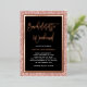 These glam, stylish bachelorette party invitations feature a faux rose gold glitter look (please note this is not actual glitter, but an image of glitter) and actual rose gold foil centre frame, with modern matching rose gold foil handwritten script. The very centre of the invitation is black. There is room to add your itinerary on the back.