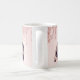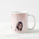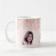 A girly and trendy monogrammed mug. A feminine blush pink background decorated with faux rose gold glitter drips. Personalize and add a name and monogram letter. Add your own photo x 2. Black and gray colored letters. The name is written with a modern hand lettered style script.